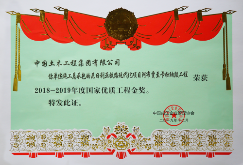 尼日利亞鐵路現(xiàn)代化項(xiàng)目阿卡段獲得2016-2017年度中國(guó)建設(shè)工程魯班獎(jiǎng)(境外工程)、2017年ENR全球優(yōu)秀工程獎(jiǎng)(軌道交通類(lèi))、2018-2019年度國(guó)家優(yōu)質(zhì)工程金獎(jiǎng)